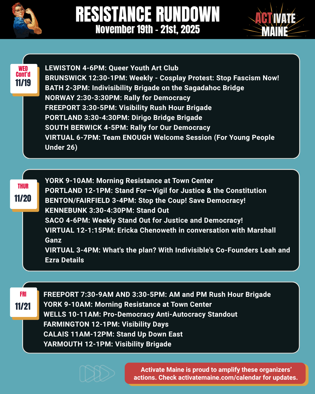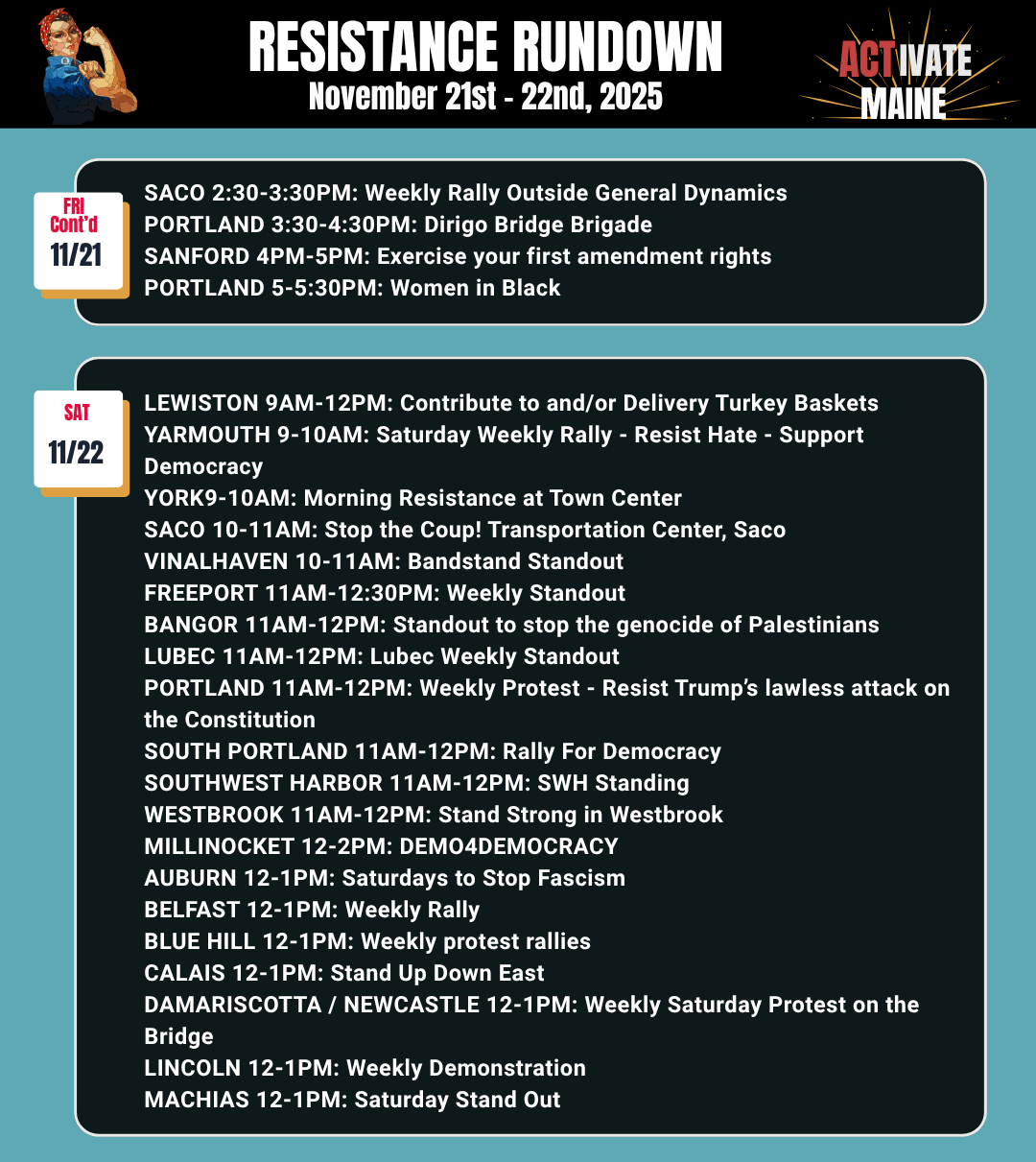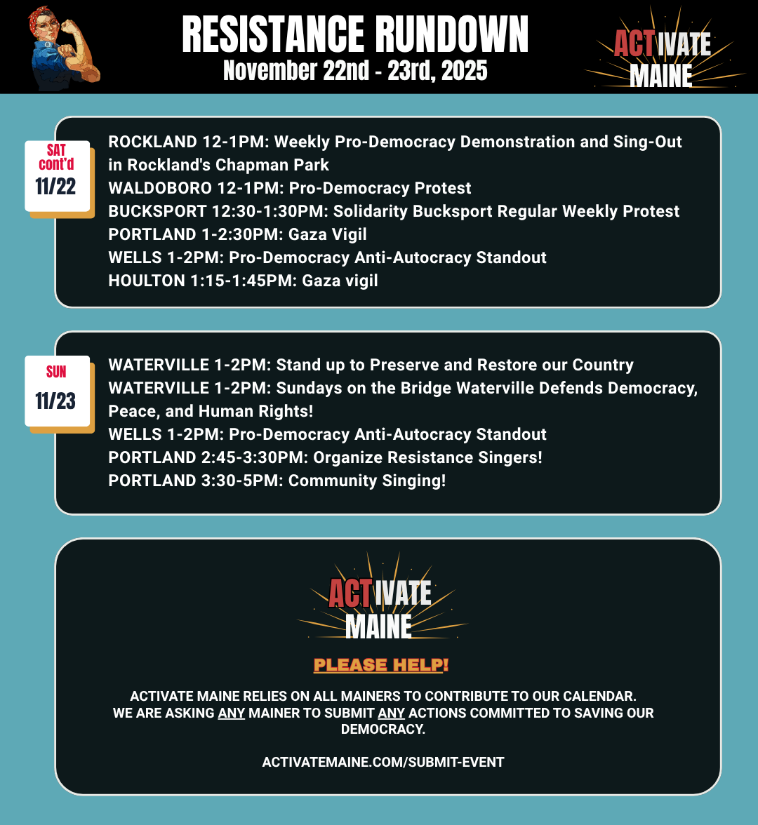 ActivateMaine.com. Website with calendar of statewide protests and community organizing events. List your events here!
